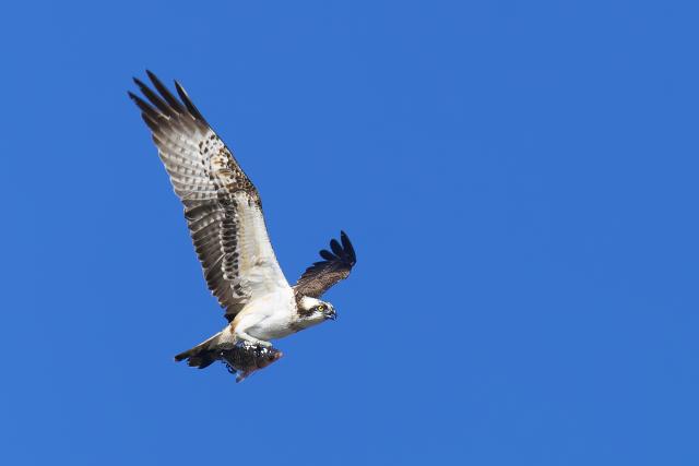 ミサゴの狩りはうまくいきました。鋭い爪でがっしりととらえて獲物を持っていきました。