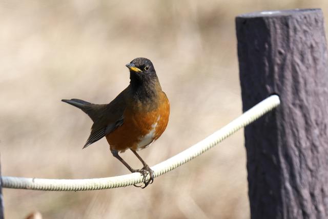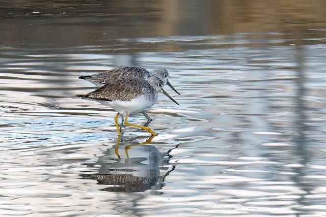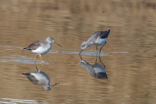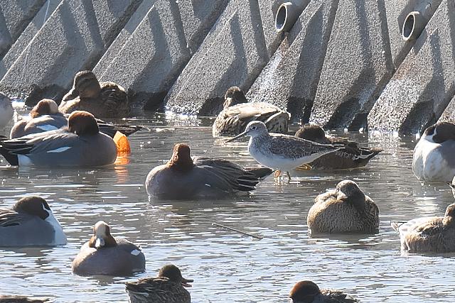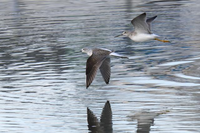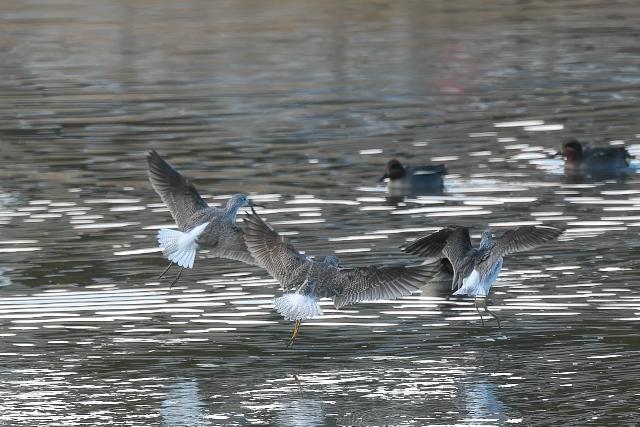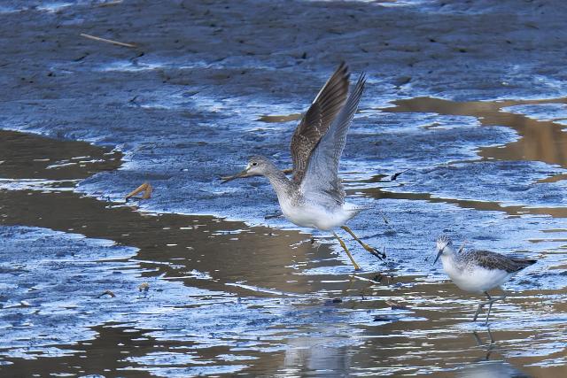 前回と同じように、沼の遠い縁にいました。 そのうちアオアシシギとともに採餌を始め、反対側の縁のほうに向かってどんどん移動してきたので、近くで見ることができました。順光で、黄色い足がより一層強調されて見えました。 あともう少しで反対側の縁にたどり着くところで、元いた方へ戻っていきました。折り返すとき少しだけ飛び、このとき背の白い部分が見えました。