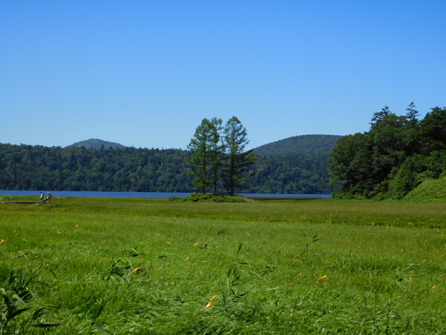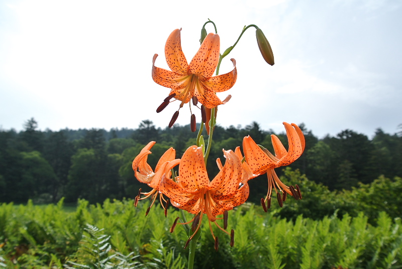 今年は8月になりましたが、私も同行できました。午後3時過ぎには雨の予報だったので、早めの行動を心がけ、沼山峠にバスで7時頃到着して歩き始めました。峠から大江湿原への樹林帯では、メボソムシクイの「チョリチョリチョリ」やルリビタキの声が響いていました。大江湿原に出ると、ワタスゲは終わり頃で、濡れていたので、ふわっとした感じはなかったです。コバギボウシやマルバダケブキ、オタカラコウ、コオニユリ、ツリガネニンジンなどが咲いていて、コオニユリが目立っていたという印象です。ニッコウキスゲの花は、1輪、2輪見つけるのがやっとでした。