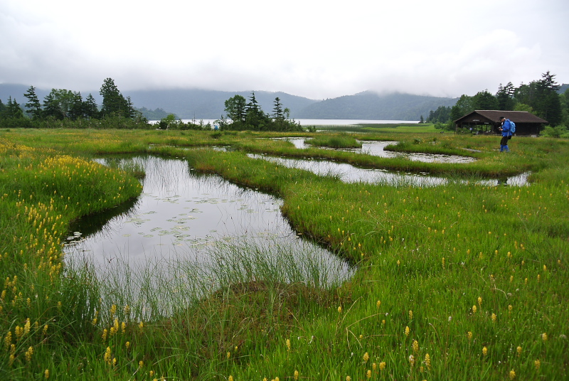 ヒュッテで朝食を取っていると、ぽつぽつと弱い雨が降ってきました。沼尻までの往復は、この天気が続きました。このコースでは、サワギキョウやキンコウカが見事でした。ヒツジグサも咲いていました。