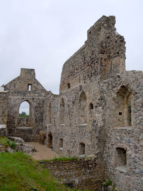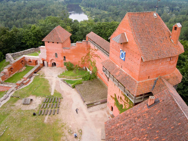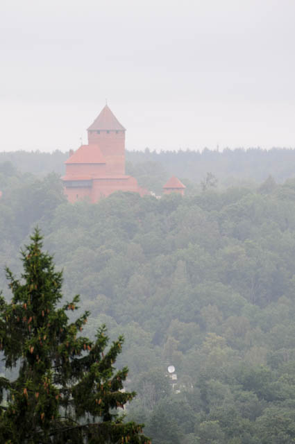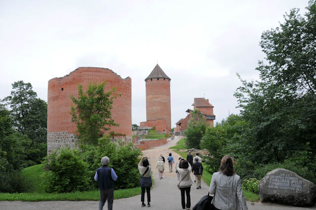 バスを降りて、トゥライダ教会を通り、トゥライダ城に向かって歩きます。トゥライダ城は、リーブ人の城を破壊して、そこにアルベルト司教が1214年に築いた城です。1950年代に修復されました。赤いレンガ色の建物は、まわりの緑に対してよく目立ちます。円柱形の丸い塔の内側の螺旋階段を上ると、眺望はすばらしく周りがよく見渡せました。