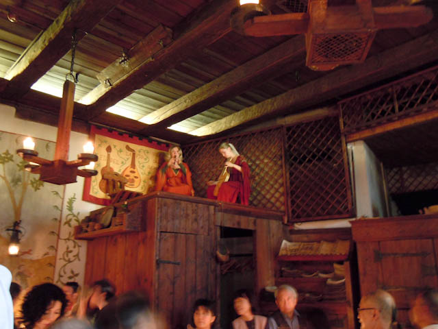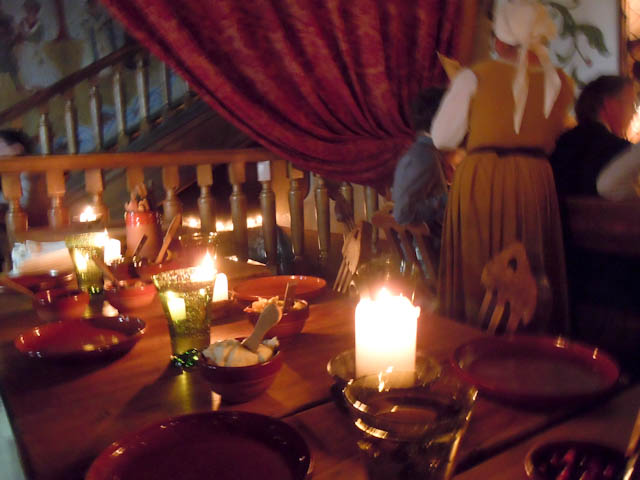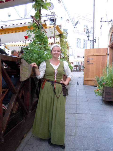 夕食は、旧市街にあるレストラン「オルデ・ハンザ」に出かけました。ホテルから歩いて10分ぐらいのところです。ヴィル門を通って旧市街に入りましたが、通りを歩く人やテラス席で食事やお酒を楽しむ観光客でごった返しています。外国人はテラス席が似合うとつくづく思います。まもなくレストランに着きました。オルデ・ハンザは中世風のコース料理が楽しめる店として有名です。働く人たちの衣装からして中世風です。店内の照明はろうそくで、ものの在りかががわかる程度の明るさです。旅行でご一緒した隣の方が手持ちの小さなライトで照らして、鶏のももとかチーズのグラタンがわかるぐらいでした。陶器のジョッキーでビールを飲み、パンを食べ、キュウリのピクルス、小豆の煮たもの、穀物の粥、ベリー類、豚の踵やすね肉などを食べたと思います。生の音楽演奏や歌のサービスもありました。お腹いっぱいになりました。