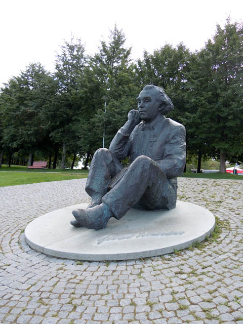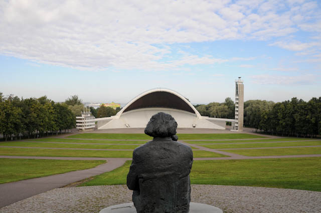 散歩を終え、ホテルからバスで歌の原に向かいました。ガイドの園部さんが、歌の原入り口で写真を使って説明してくれました。写真のように会場が人で埋め尽くされると、最大15万人になるとのことです。5年ごとに「エストニア歌とダンスの祭典」が行われる場所です。この会場は、歌の祭典以外にも使われ、今までにマイケルジャクソン、マドンナもきたことがあり、明後日にはレディガガのコンサートがあるそうです。舞台に向かって座っている像は作曲家のグスタフ・エルネサクスです。彼は「歌う革命」で大きな役割を果たした人だということです。