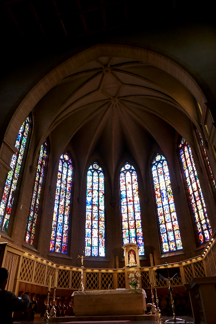 祭壇のステンドグラスが美しかった。ステンドグラスは単に美しいというだけでなく、文字の読めない信者にキリストの教えを伝える役割もあったと聞き、そういえば昨年アンコールワットを見学した時、壁画の絵にも同じ役割があったのを思い出し、ステンドグラスと壁画が私の中で結びついたのでした。