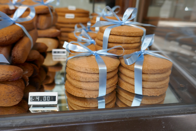 | カラフルな橋の上のサックスのオブジェ | クックドゥディナン 堅焼きクッキー |