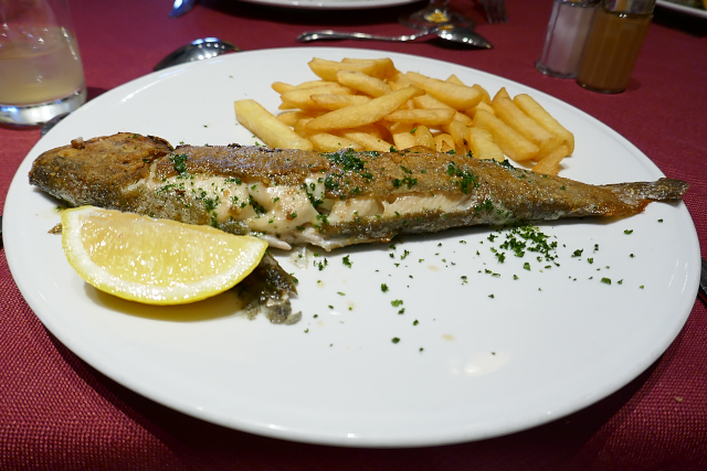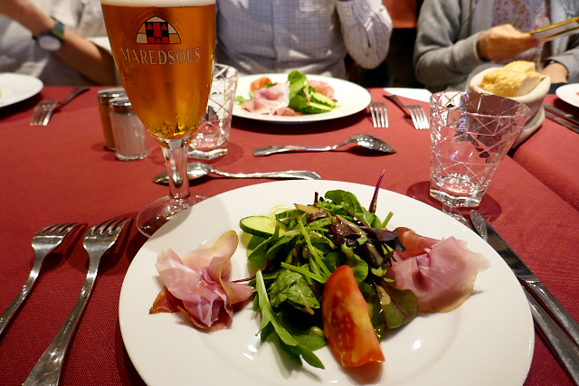 アルデンヌ産の生ハムで、他の生ハムとの違いはわからなかったけれど、おいしくいただきました。白身魚のムニエルもなかなかの味でしたよ。