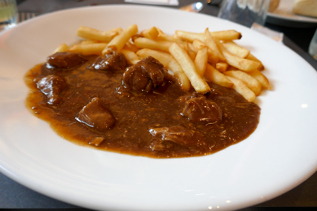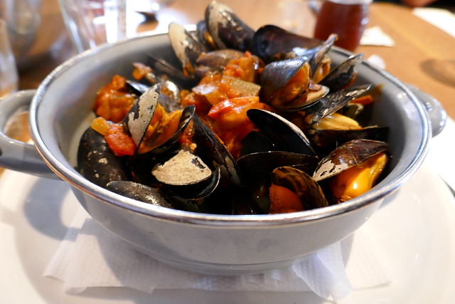 多くの人は名物の「ムール貝の白ワイン蒸し」を注文していましたが、私はトマト味の「プロバンス風」にしてみました。『名物に旨い物なし』と云われますが、これは美味しい。食べ方にこつがあって、身を取ったムール貝の殻を指先に持ち、これをフォーク代わりにつかって身を挟んで取り出し、ただひたすら食べ続けました。煮汁もおいしくてスプーンですくって飲みました。デザートはアイスクリームがのったブリュッセル風ワッフルで、これもおいしくいただきました。