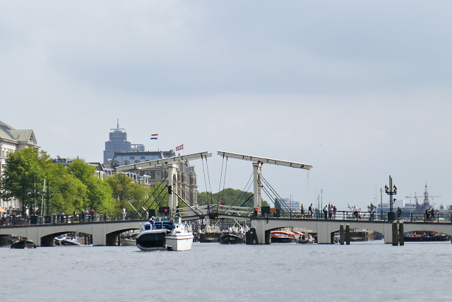 クルーズ船の船内から、「マヘレの跳ね橋」が見えました。ガイドさんが、こっちのは違う、あっちが本物と言っていた方ですから、写真はたぶんマヘレの跳ね橋でしょう。アムステルダムで唯一の木造とのことです。
