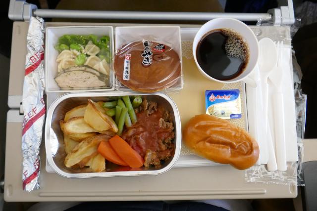 食事は1回提供され、ビーフとチキンでした。チキンを選んでご飯を食べればよかったと、後で思ったので帰りの朝食はチキンにしました。が、・・・チキンと伝えたつもりが、開けるとソーセージでした。思い通りに頼めなかった機内食です。