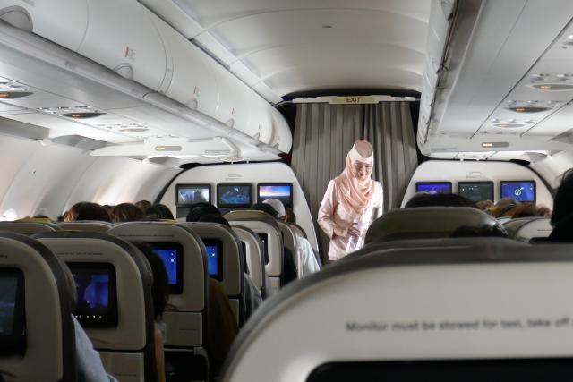 ブルネイは国教がイスラム教です。キャビンアテンダントの制服もそれを反映してソフトピンクのヒジャブ姿でした。お酒は提供されません。シートとシートの間隔が狭くてちょっと窮屈に感じました。飛行機は順調に飛び、予定よりも少し早く到着しました。