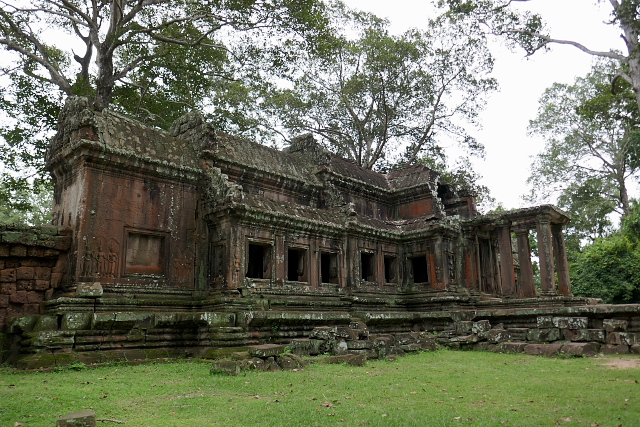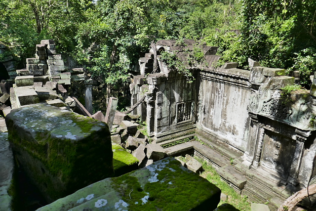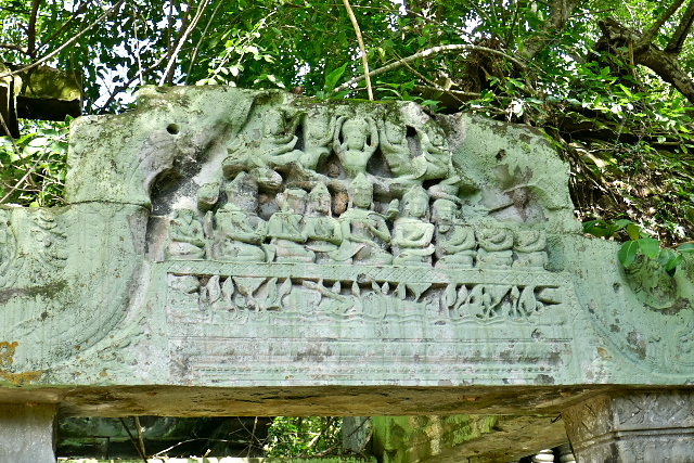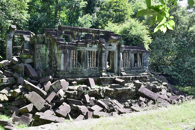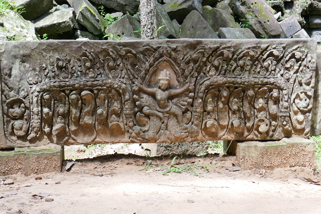 | アンコールワットと同じように連子窓が多用されていた | 経堂の破風に彫られたレリーフ | 柱がわずかに残っている | 崩れた屋根 |