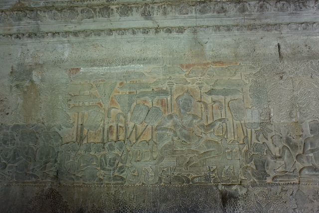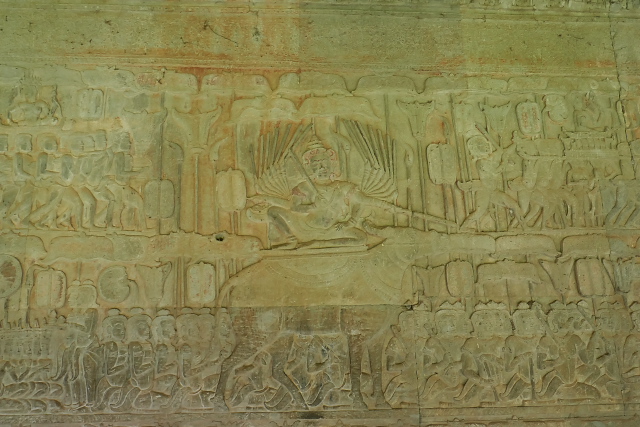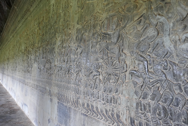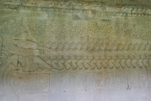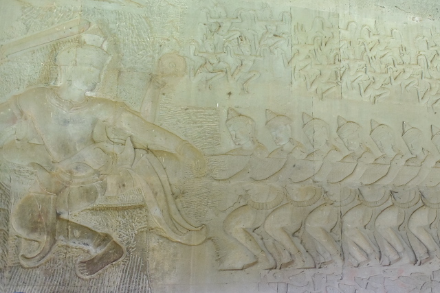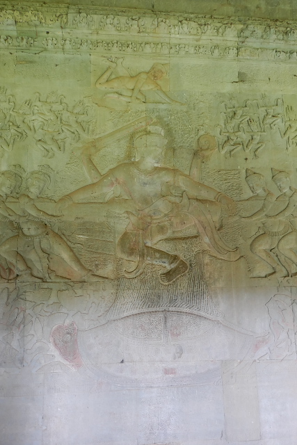 第一回廊のレリーフはアンコールワットの一番の見どころとされ、ヒンドゥー神話などの物語が彫られています。西面にはインドの古典叙事詩マハーバーラタ、ラーマーヤナ、東面には乳海撹拌の有名なシーン、南面には、スールヤヴァルマン二世の行軍と死後の世界を表した天国と地獄の様子、そして北面にはクリシュナと悪魔バーナの戦い、アムリタを巡る神々と阿修羅の戦いが刻まれています。