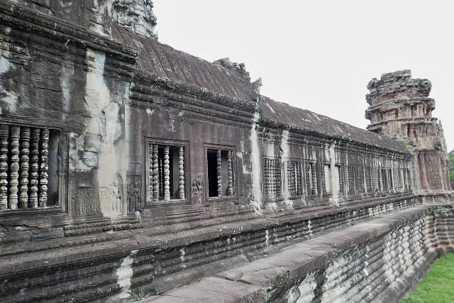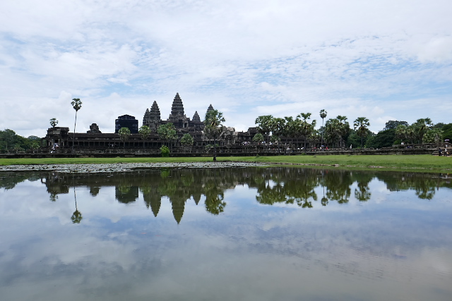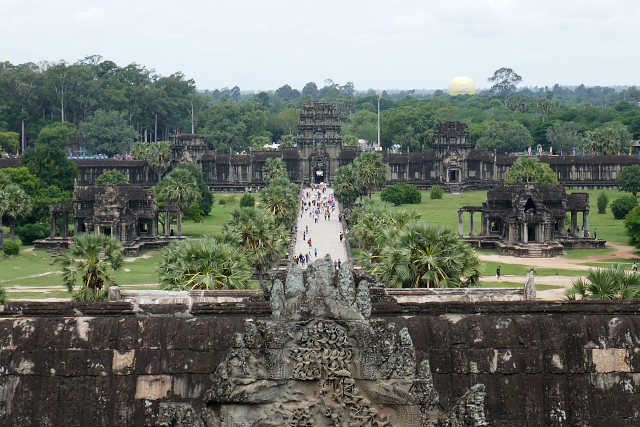 アンコール・ワットは、12世紀につくられたビシュヌ神を祀るヒンドゥー教寺院です。世界遺産になっています。敷地は東西1.5q、南北1.3q、幅200m、長さ600mの広さです。おもな見どころは・東西南北の門 ・第一回廊・十字回廊 ・第二回廊 ・第三回廊 ・中央塔を含む5つの尖塔です。今回はマラソン大会が開催されるため、西門からのルートではなく東側から入りました。東の門の横を通って、第一回廊、第二回廊を通り第三回廊へと進んでいきました。