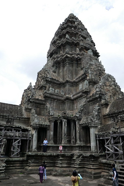 第二回廊を出ると、前面に第三回廊と中央祠堂(ちゅうおうしどう)が見えています。第三回廊へは、人数制限が行われていて、40分ほど並びました。順番がくると、とても急な階段を上って第三回廊にたどり着きました。中央祠堂はアンコールワットの中心部で、ヒンドゥー教の宇宙の中心である須弥山を模しているといわれています。第三回廊を降りて、十字回廊、聖池で逆さアンコールを見て、アンコールワットの見学が終わりました。