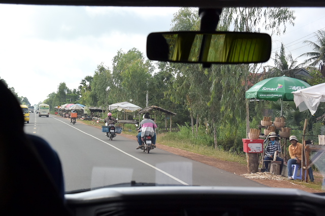 ベンメリア遺跡に向かう沿道の風景です。短く切った竹の筒を売っている店がいくつも並んでいるところがありました。中には煙が上っているところもあります。ミエンさんによると、これは「クロラン」といい、中にお米と砂糖、ココナッツミルクを入れて蒸したもので、カンボジアのおやつだそうです。カンボジアの人は、これをお土産に買っていくようです。