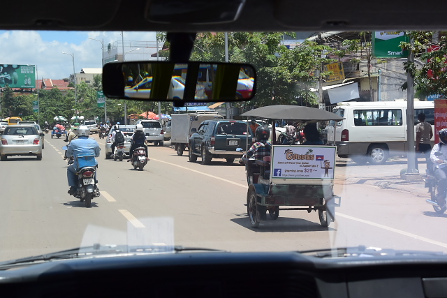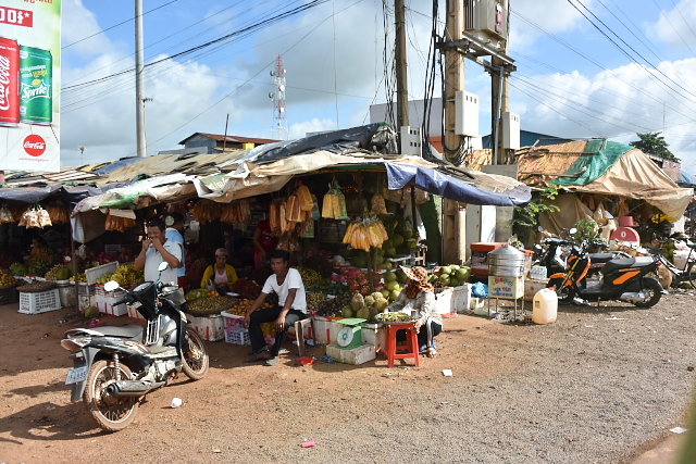 小さな町を通ると、果物や雑貨を売る店も並んでいます。ガソリンスタンドが少ないので、中には、ペットボトルに入れたガソリンを売っているところもあります。道路にはバイク、トゥクトゥク、自動車が入り交じって走っています。広い道路では、自動車とバイクの道が分離していますが、田舎道はどの車両も同じ道を走っています。