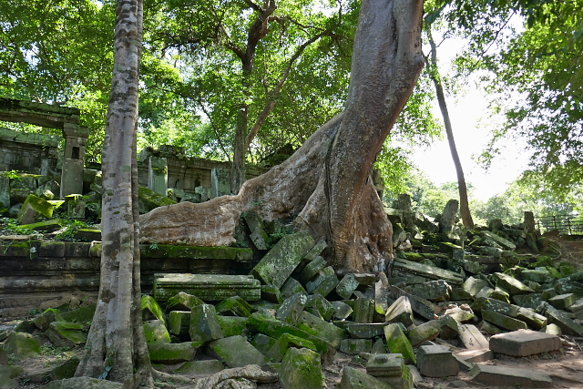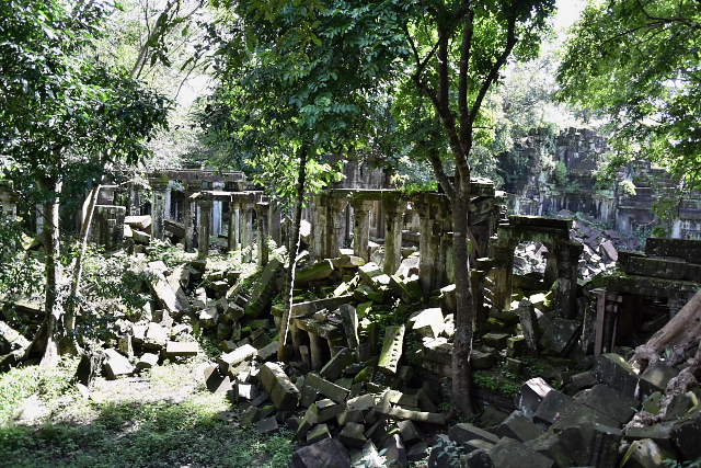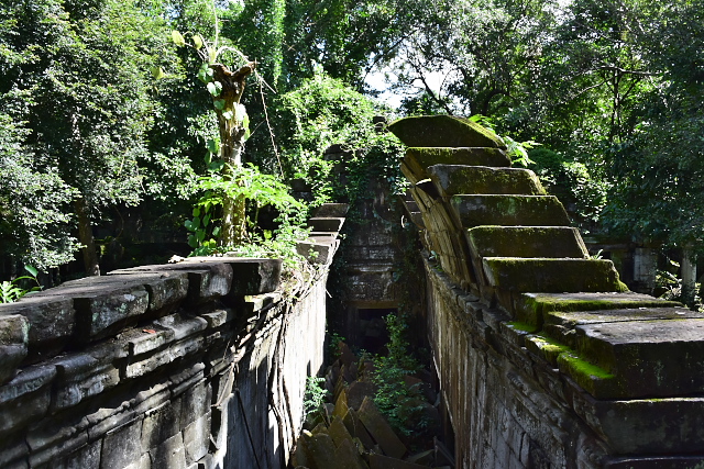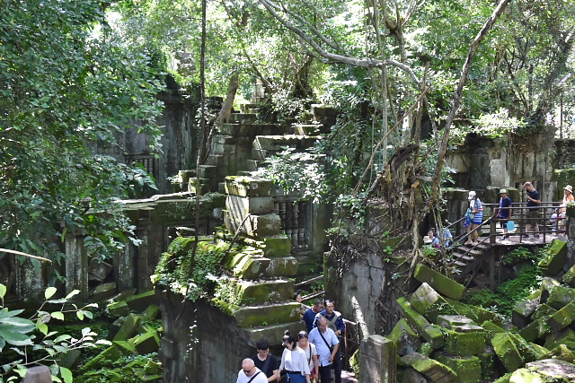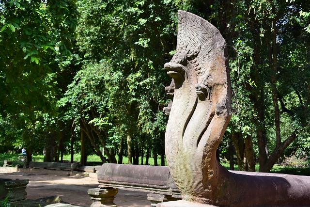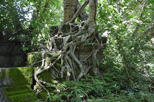 ベンメリア遺跡へは1時間半ほどかかりました。車を降りて、左右樹木に囲まれた石畳を少し歩くと、きれいな姿で残っているナーガ、そして崩れた石とその向こうに門のような風景が見えて来ました。とても静かで落ち着いたところです。寺院の修復や樹木の伐採はほとんどしておらず、寺院発見当時のままを見ることができるので、自分が発見したかのように身近に感じます。気に入りました。タ・プロム寺院で見たようにカジュマルの木でしょう、根っこが至る所にのびて、遺跡と一体となっています。ミエンさんの話では、当時は野鳥もたくさんいて、木の種を運んできたのは彼らだとのことです。