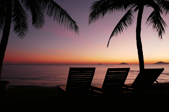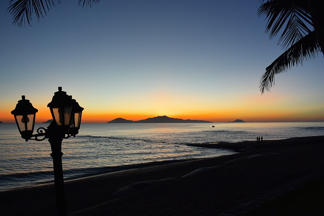 | 街灯をいれて朝焼けを撮りました | 椅子を入れて朝焼けを撮りました | 帰りはダナン発成田行きです | 成田空港上空です |