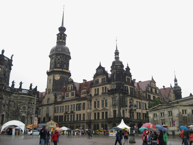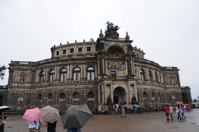 ツヴィンガー宮殿のアルテ・マイスター絵画館では、時間が限られていたので、もらったパンフレットにある絵だけを探して見てきた。自宅近くのサイゼリアの壁に2人の天使の絵が描かれているが、本物の絵は2人だけが独立した絵ではなく、ラファエロの『システィーナのマドンナ』の聖母マリアの足元に描かれた天使の2人だった。他にフェルメール『手紙を読む女』、J. E. リオタール『チョコレートを運ぶメイド』、ジョルジョーネ『眠れるビーナス』などを急ぎ足で見てきた。美術館のショップには、1945年のドレスデンの街の写真を載せた絵はがきがあった。街の中は、建物が破壊され、壁や柱だけが残っていたり、瓦礫の山があったり、無残だった様子が見て取れる。あれだけ破壊されていたのに、ざっと歩いただけだが、よくここまで復興、復元したなと思う。人間は馬鹿なこともするが、凄いこともできるってことかな。雨があがっていたら、もう一度外の市民祭りの様子や、美しい建築物などをみたいと思ったが、残念ながら雨は降り続いていた。