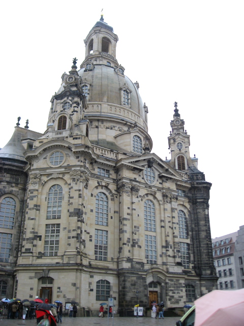 フラウエン教会は、第二次世界大戦で左右の柱を二本残して崩壊した建物だが、統一後に11年間をかけて再建され、古い黒っぽい石と新しい白っぽい石のまだら模様には、ドイツの人たちのいろいろな思いが込められているという。ドレスデンの平和のシンボルになっている。