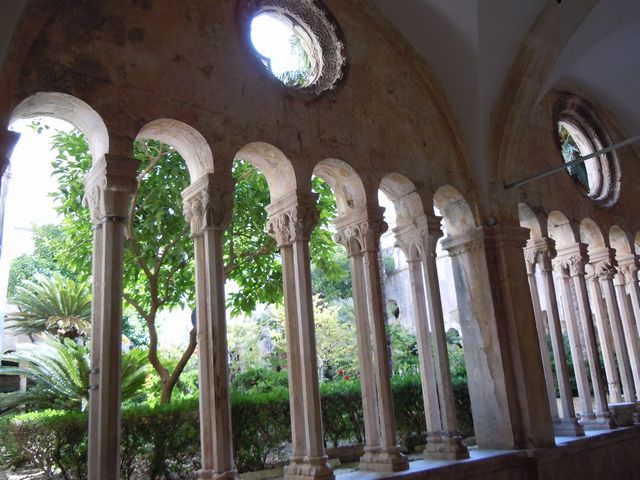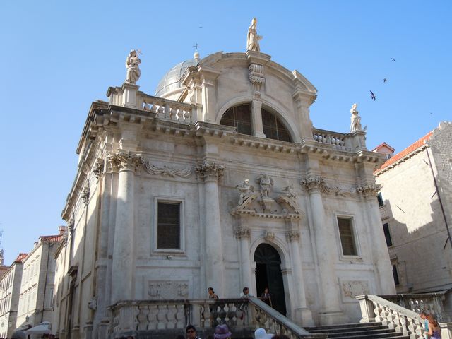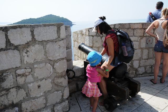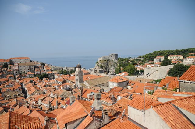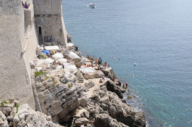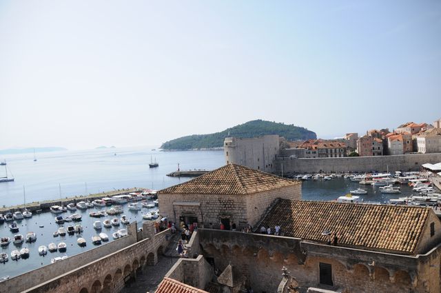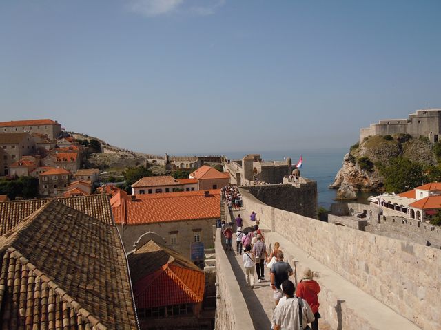 ピレ門から入った。プラツァ通りは広いが、そこから別の通りへ入ると狭い。人がやっとすれ違うような隙間だ。日陰を作って暑さをしのぐ目的があるという。フランシスコ会修道院には世界で3番目に古いという薬局があった。さらに大聖堂などをみて、城壁にあがった。スペインからの大型客船が到着していることもあって、城壁に上る観光客は多く、のろのろと車の渋滞のような感じで歩いた。上からは城壁の内側や外側がよく見えた。城壁の上は陰になるところがなく、暑さと必死で戦いながらほぼ一周歩いた。城壁にくっつくような岩場で海水浴を楽しんでいる人たちも見かけた。この暑さだから、城壁を歩くよりは海水浴のほうが健康にいいだろうな。