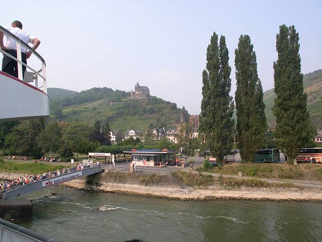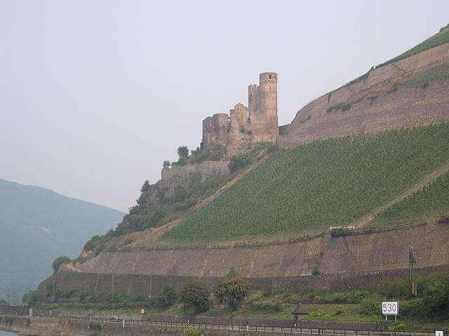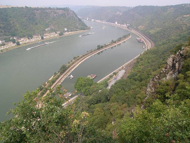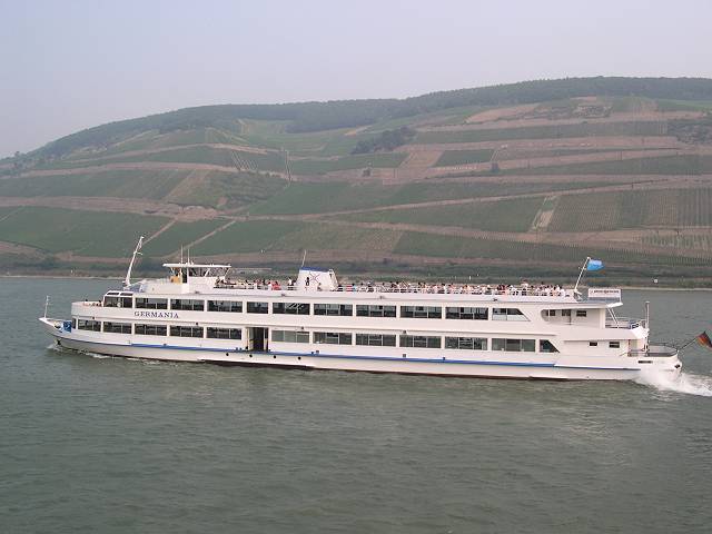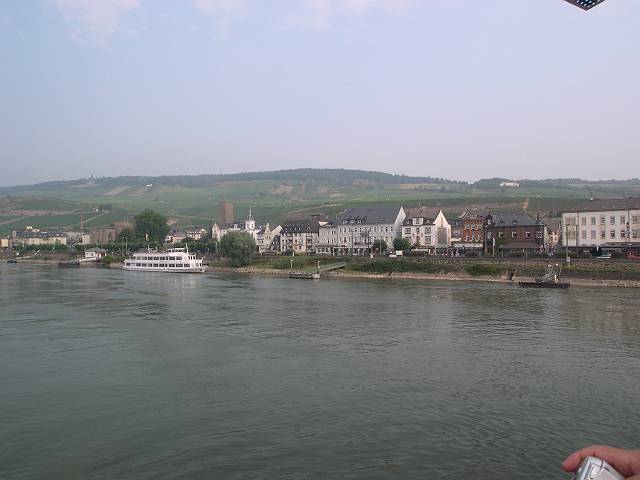 ライン川はドイツの3大大河の一つで、今でも物資輸送の重要な経路として利用され、また観光の資源として考えれている。そのため、橋は架けられずに渡し船が活躍している。幅が広く、川の左右にはぶどう畑と古城がみえ、すばらしい景色だ。