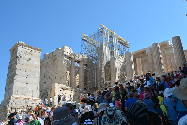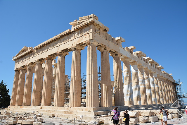 パルテノン神殿は今回の旅行の目的のひとつだ。ガイドさんの説明によると、パルテノンとは乙女の館という意味という。柱の数は8:17で合計46本、美しく見せるための工夫として、1本1本の柱は中央部が膨らんだエンタシス、そして柱は建物の内側に傾斜しているという。また、柱が立つ長方形の土台の中央は盛り上がって、雨水が溜まらないようになっているのだとか。さまざまな英知が詰まって、美しさを表現している建築である。修復が済んだら、さらにすばらしい姿を見せてくれるのだろう。