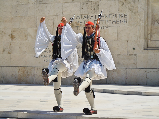 国会議事堂の正面下の壁面に、1821年以降ギリシャでの戦いで犠牲になった兵士の碑がある。これを守る衛兵はエヴゾネスと呼ばれ、1時間毎に交代している。その場面をちょうど見ることができた。暑い中、大変な仕事だ。