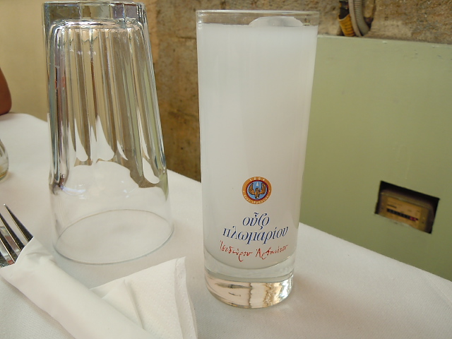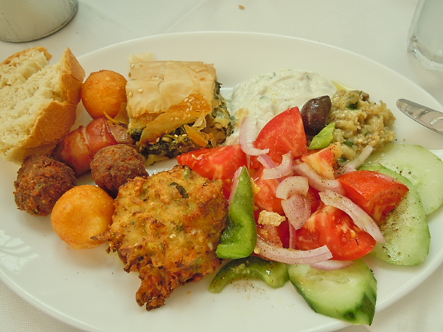 葡萄の搾りかすからつくる蒸留酒で、アニスで香り付けしてある。試してみたが、この香り八角に似ている。私は八角は大の苦手。頼んでみたものの、水で割って白くしたところまでだった。メゼはギリシャ料理の盛り合わせのことで、これは美味しくいただいた。