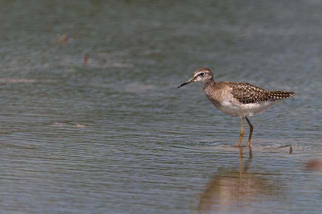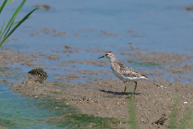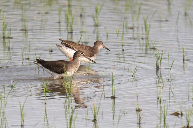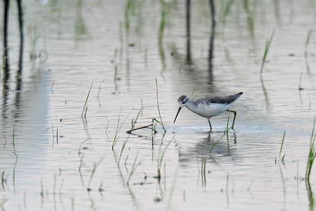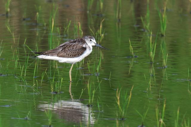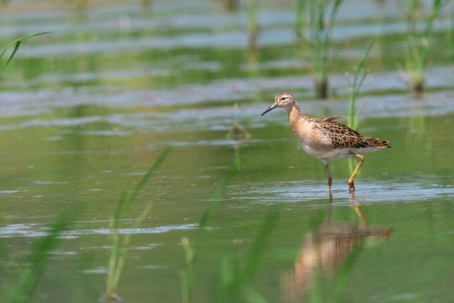 田んぼをのぞくと、シギなどがたくさん見られました。とくに、ヒバリシギが群れで見られ多いなという印象でした。水が入った田んぼに緑色を背景に見るシギたちはとても美しく見えました。