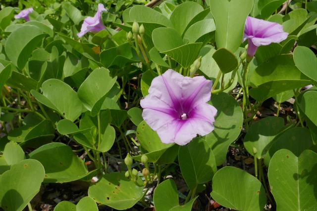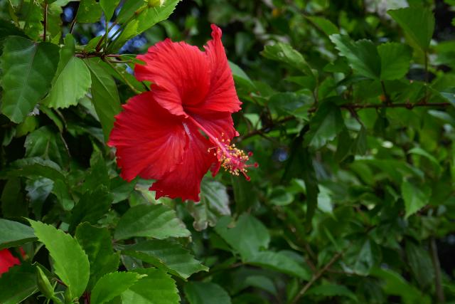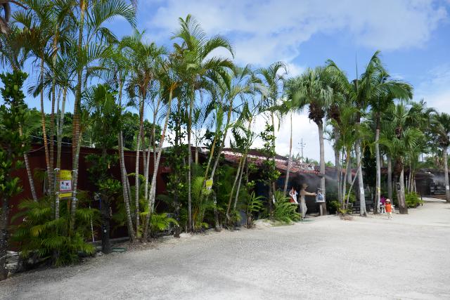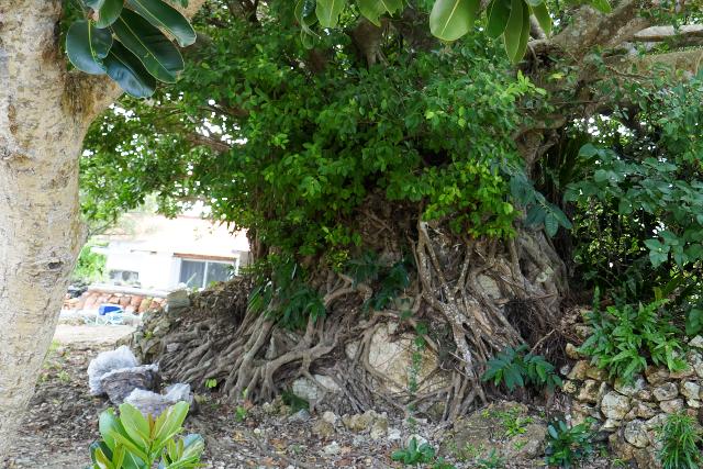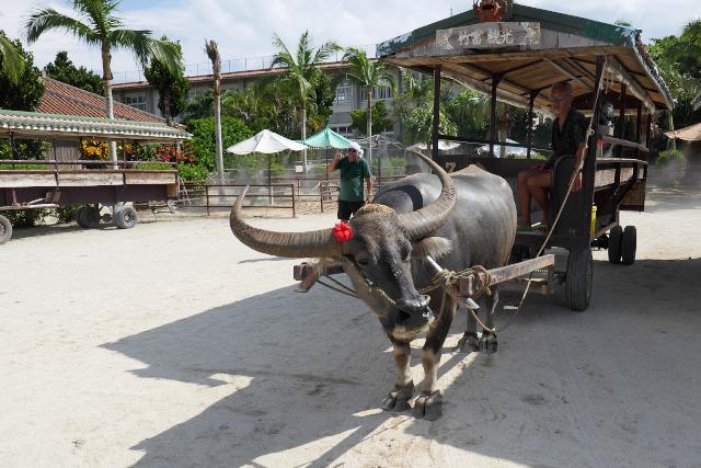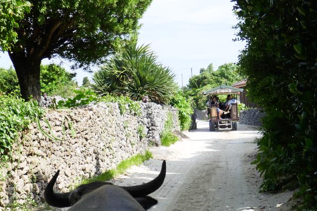 水牛車は、両側にヒンプンとよばれる石垣の塀のある細い道を進みます。ハイビスカスやブーゲンビリアなどの花がきれいです。馭者(ぎょしゃ)の三線(さんしん)と歌のサービスもありました。水牛は何度も同じ道を通るので慣れたものです。途中水牛の判断で休憩などをとり、狭いカーブも車がぶつからないよう内輪差を考えたコースを選びます。馭者は自動運転と言っていました。