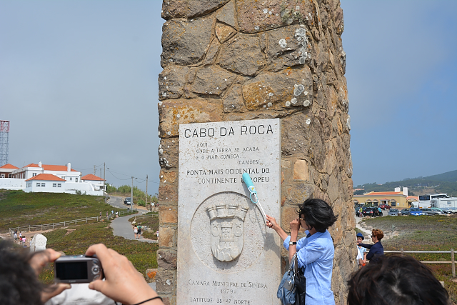 シントラをあとにして、ロカ岬に着いた。ロカ岬は、ユーラシア大陸最西端に位置する岬で、高さ144mの断崖絶壁が大西洋に突き出ている。突端に立つ十字架の塔に詩人ルイス・デ・カモンイスによる「ここに地終わり、海始まる」という一節が刻まれていて、ガイドさんがその説明をしている。あたりには、海岸性の植物が生えていて、硬い棘をもっていて触ると肌が傷つきそうだ。下は崖になっていて、柵がつけられていた。風が強く吹く中、遊歩道を少し歩いて最西端まで来たことを心に刻んだ。記念に花文字で名前が記された最西端到達証明書を発行してもらった。