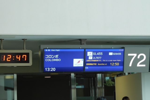 集合時刻よりも早めに成田空港第2ターミナルに到着して、添乗員のKさんから説明を受けました。丁寧です。コロンボへの直行便は週4便運行されています。毎日ではないせいかスーツケースを預けるための列が長く、 40分ほどかかりました。その後、アメリカン航空のラウンジで昼食をとり、出発まで待ちました。