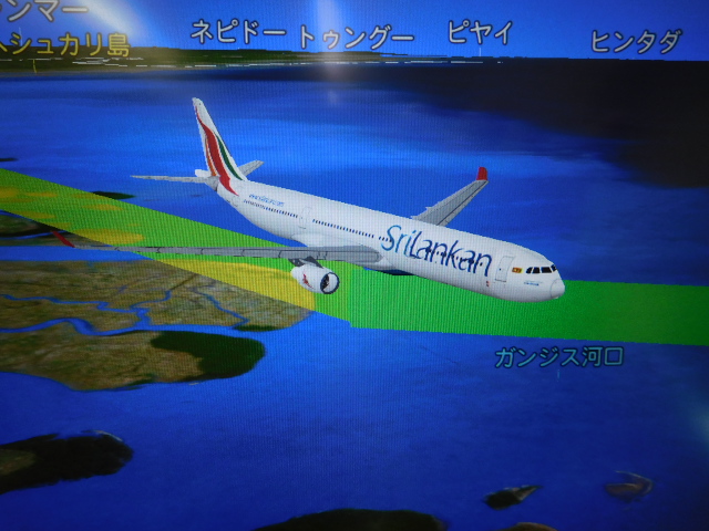 用意された映画は魅力的なものはなかったけれど、画面操作はとてもスムーズでした。現在地を示す地図が立体的で、向きを変えることや拡大縮小が思いのままでした。妻はこの地図が結構お気に入りの様子でした。2回の食事、映画を1本、そして音楽を聴くなどで時間を過ごして、現地時間の午後7時過ぎに予定通りバンダラナイケ国際空港に到着しました。