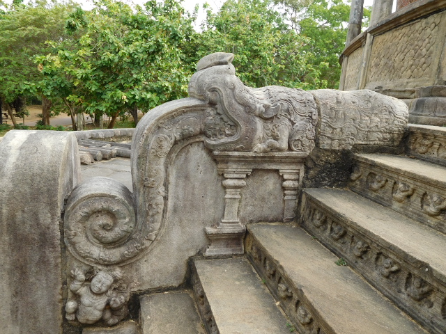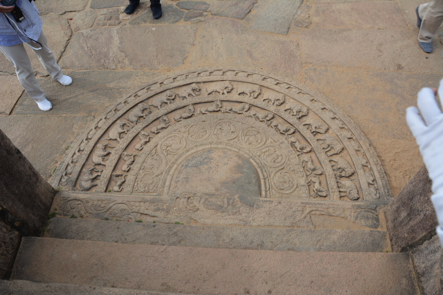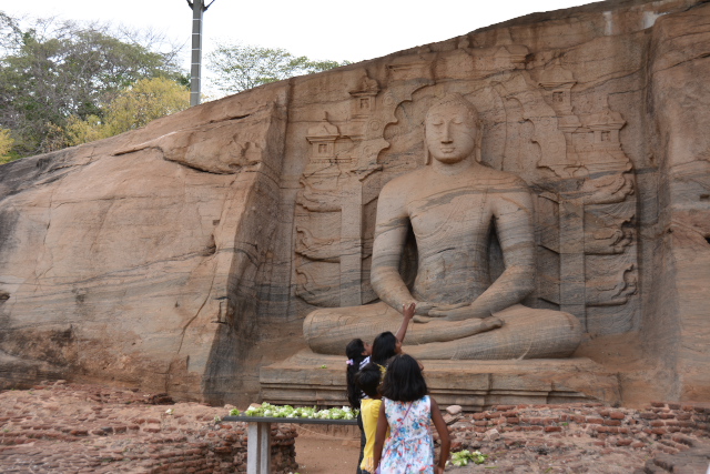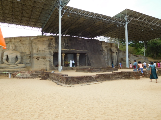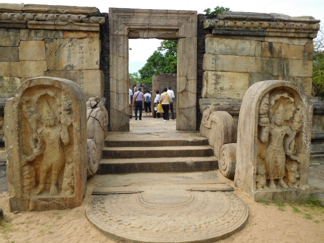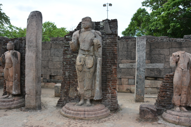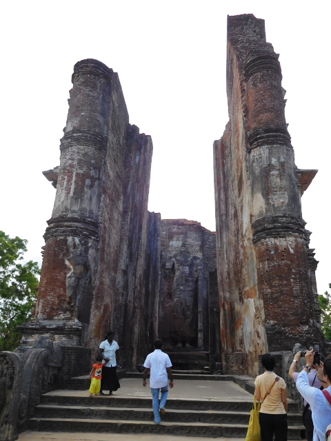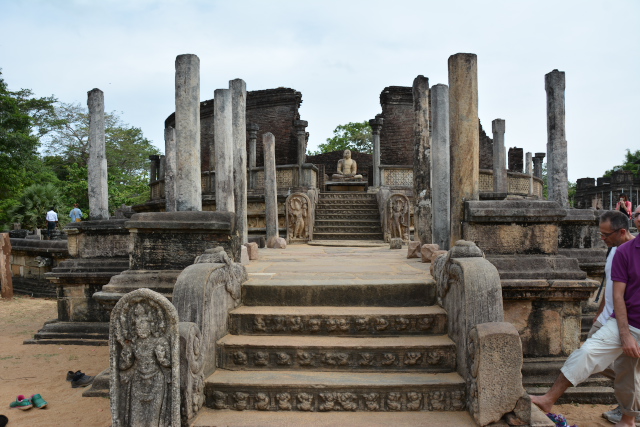 ポロンナルワは10〜12世紀にシンハラ王朝の首都があった所です。仏教都市として栄え、タイやビルマからも僧が訪れたといいます。その繁栄を伝える遺跡が世界遺産となっていて、クワドラングルが遺跡群の中心エリアで、四辺形の城壁に囲まれた庭に11の建築物が集まっています。靴を脱ぎ、帽子をとって見学しました。