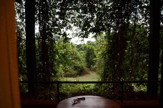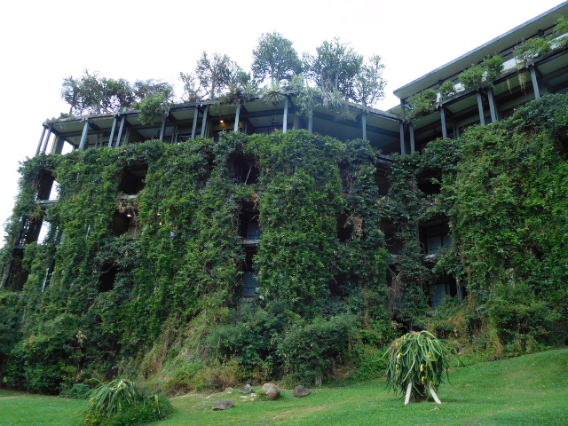 ヘリダンス・カンダラマは特別な地形に建っているらしく、私たちの部屋は2階で、道路に面していたロビーは5階です。ロビー階が地上階としたらここは地下ということになります。どうなっているのでしょう。朝になって窓を開けると、目の前にはつる性の植物がぶら下がっていて、その間から芝生が見えます。芝生からの高さからここは2階で間違いないようです。どうやらこのホテルは、表側と裏側の地上の高さが異なるところに建っているようです。