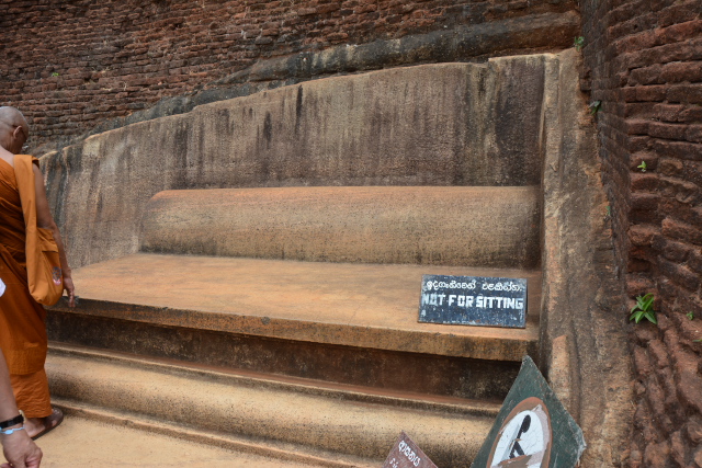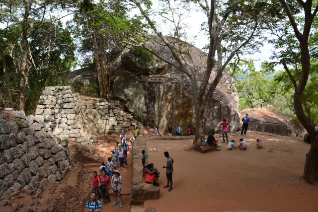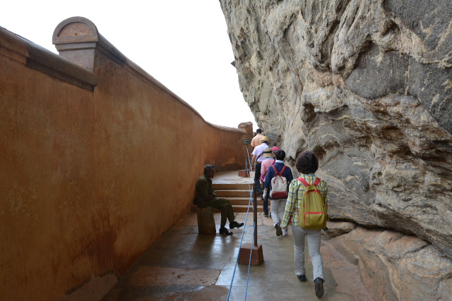 ホテルからバスでシーギリアロックにきました。チケット売り場からシーギリアロックの登りの階段のところまでは、まっすぐな道になっています。道の左右は水圧を利用した噴水などがあるウォーターガーデン、石で作られた洞窟や門などが残るロックガーデンになっています。登りの階段の所に達すると、すでに長い列ができていて、止まったり動いたりの繰り返しになりました。この列は、らせん階段、ミラーウォール、ライオンの足へとずっとつながっていて、わたしたちを含めて観光客のみんなは、忍耐強くこの動きに従うしかありませんでした。