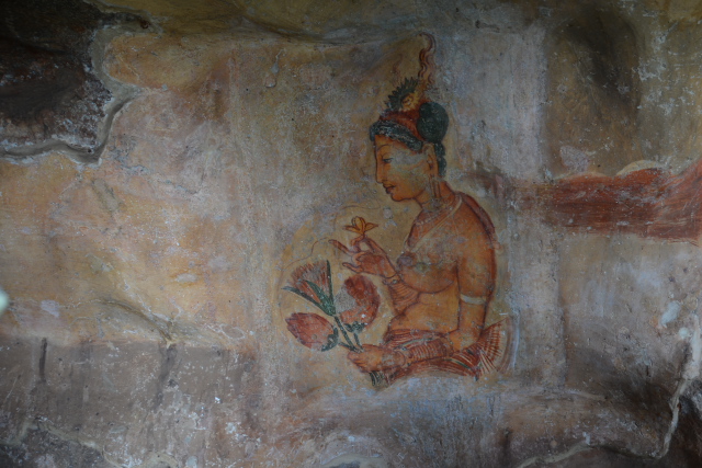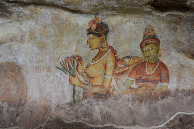 私は高い所がダメなので、らせん階段はとても苦手でしたが、何とか登り終えたところでシーギリア・レディーを見ることができました。岩壁に描かれたフレスコ画です。美しく豊満な体が特徴と聞いていましたが、まさにそのとおりでした。緑色や白色、赤い色など鮮やかな色が残っていて、渋滞をがまんするだけの価値はあるなと思いました。フラッシュ撮影が禁止されていましたが、その程度の保護で後世に伝えられるのだろうかちょっと心配になりました。