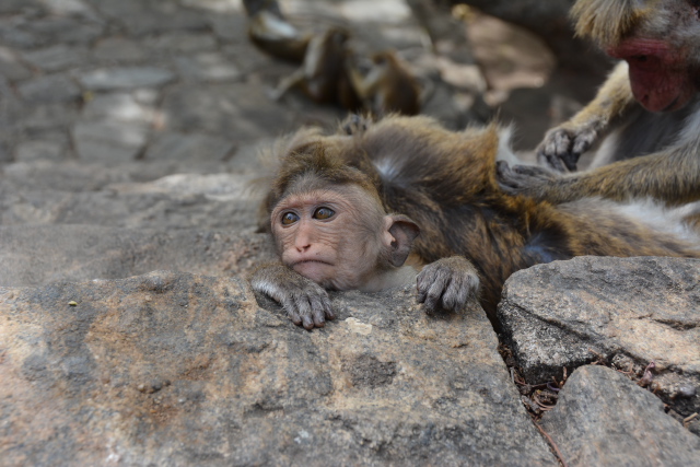 チケット売り場で、現地ガイドGさんからチケットをもらって石窟寺院への階段を上りました。階段にはトクモンキーがあちこちにいて、寝そべったり毛繕いをしたりしています。犬や人も多いです。20分ほどで石窟寺院のある山頂に到着。靴を預けて入り口を通ると、手前から第1から第5まで5つの石窟が並んでいます。最大の石窟は第2石窟です。天井のブッダの絵が素晴らしいかった。ブッダの生涯や侵略者との戦いの物語が描かれているとのことでした。