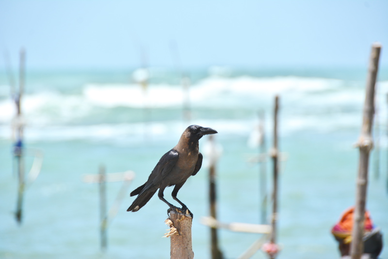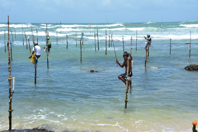 寺院からの帰り道、ポールフィッシングを見学しました。スリランカの伝統釣法で、海に立てた竹馬のような棒に座り、釣り竿で小魚を釣り上げる釣法です。出発前に見た、「世界の街道を行く」では「ストルトフィッシング」と呼んでいました。餌はつけずに、手作りの針でひっかけて釣ります。朝3時から8時頃まで小魚を一人30〜40匹釣り上げるそうです。海岸にいた老人は9人を束ねる親方で、魚は朝のうちに売ってしまうとのことでした。この時は魚の群れが近づいて、海に黒い部分ができていましたが、網を使うことを禁止して、魚の減少を抑えているようです。