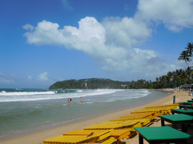 ヌワラエリヤの寒さとはうって変わって、晴れていて蒸し暑い天気です。今日の午前中は南海岸の観光です。リミッサはサーフボードやウインドサーフィンが盛んな町として知られていますが、立ち寄って海岸を見るだけです。美しい海岸です。観光客が海水浴をしていました。