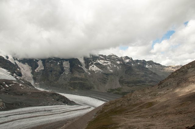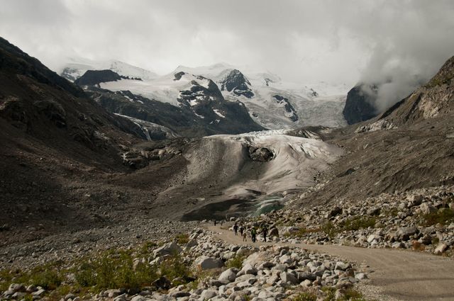 バスでベルニナ線のサンモリッツ駅まで行き、1時間ほどでモルテラッチ駅に着いた。ここから、氷河が見えるところまで歩く。ときおり雨がぱらっと降る天気だが、何とか持ちこたえてくれている。コース脇にはいろいろな花が見られ、遠くにホシガラスが飛んでいる。山が両脇に迫っている。