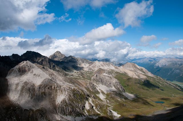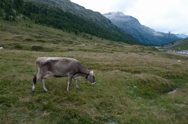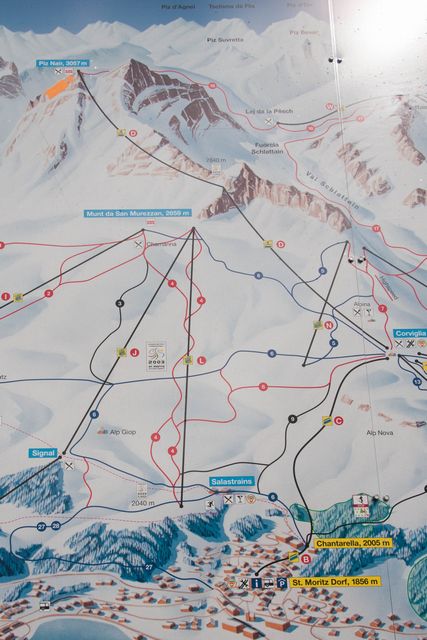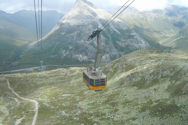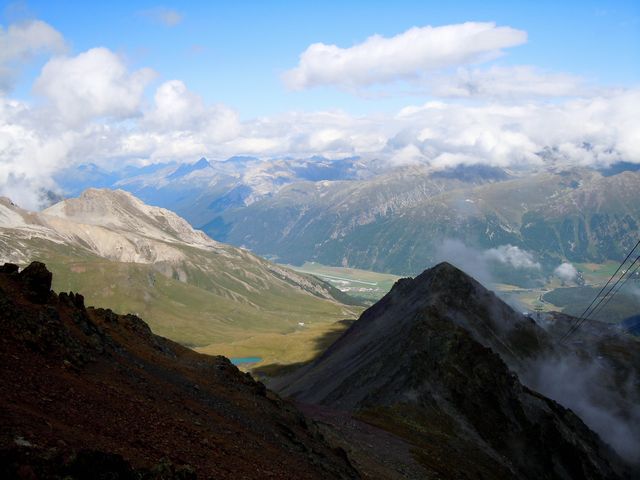 サンモリッツまで戻って、自由時間となった。雨がぱらついているが、持っているパスを有効に使って、ケーブルカー2つとロープウェイを乗り継いでピッツネイル展望台に行ってみた。途中マーモットの姿を見た。展望台では、所々に青空がみえて視界が広がっていた。天気も少々回復してラッキーだったようだ。ひとしきり展望を楽しんで、最終の便で従業員の人たちとともにサンモリッツに下りた。