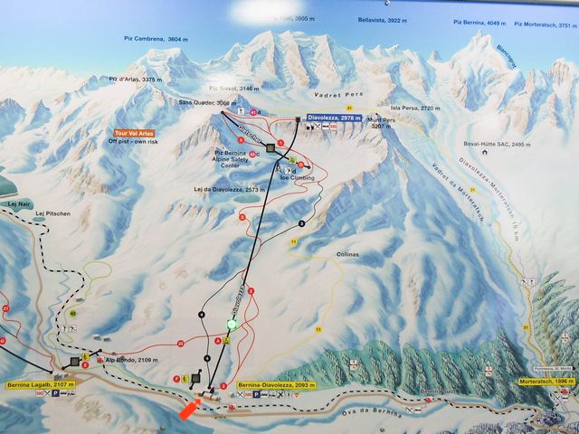 | 日程 | ホテル発8:10---(ベルニナ線)---モルテラッチ着9:20---(徒歩)---モルテラッチ氷河見学---(徒歩)---モルテラッチ発11:15---ディアヴォレツァ11:30着11:40発---(ロープウェイ)---ディアボレッツァ展望台(2978m)11:50着(昼食・展望)発14:00---(ロープウェイ)---ディアヴォレツァ14:10着14:34発---(ベルニナ線)---サンモリッツ15:15着---(徒歩)---サンモリッツ・ドルフ15:30着発---(ケーブルカー・ロープウェイ)---ピッツ・ネイル展望台(3057m)16:20着(展望)16:50発--(ケーブルカー・ロープウェイ)---サンモリッツ17:30着---coopで買い物をしてバスでホテルへ18:00着 |