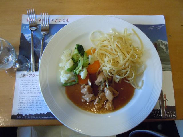 駅まで戻って、再びベルニナ線でディアヴォレァ駅、そこからロープウェイでディアヴォレァ展望台へ上った。展望台でまず昼食をとる。ウェイターが「めしあがれ」「大吾郎」「ありがとう」の3つの単語でみんなを笑わしてくれる。スイスの食事はわるくないと思う。上着を着て外へ出た。気温6℃。残念ながら、上の方は雲で覆われて見えない。ピッツベルニナはあのあたりに見えるはずだと、想像を巡らして見たつもりになる。