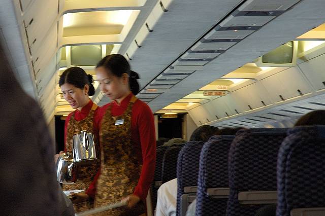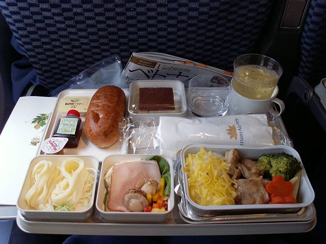 飛行機は定刻より20〜30分遅れて11:20頃離陸した。この便はベトナム航空と日本航空のコードシェア便となっていて、行きはベトナム航空の機材・乗務員で運行され、帰りは日本航空の機材・乗務員で運行される。空席もあって、今までの旅行の満席の印象とちょっと違うという感じだ。スチュワーデスはアオザイ姿のベトナム人。上は赤、下は白のパンツ姿で、ベトナムの雰囲気が十分に伝わってくる。