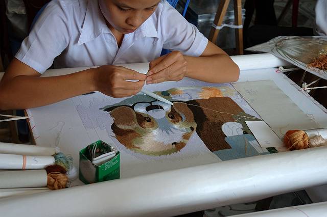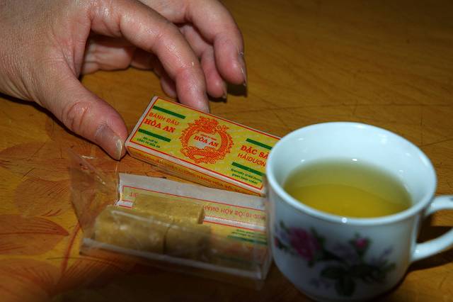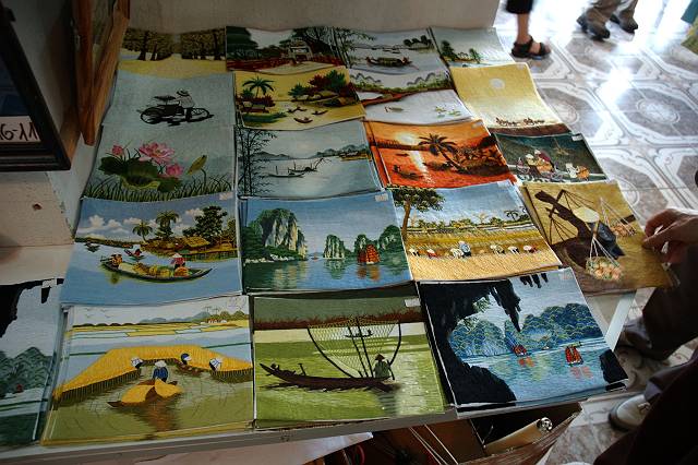 途中ちょうど中間地点で刺繍工房が併設されているドライブインに立ち寄る。ベトナム戦争で使用された枯れ葉剤のために何代にも渡って障害を持つ人が生まれるという。その障害者が働くところだそうだ。みんな元気そうに働いている。できあがった刺繍製品もたくさん売られていた。お茶請けに出された菓子と同じものを25000ドンで購入する。それにしても蒸し暑い。ドライブインはクーラーなど効いていない。車の中が唯一涼しいところだ。