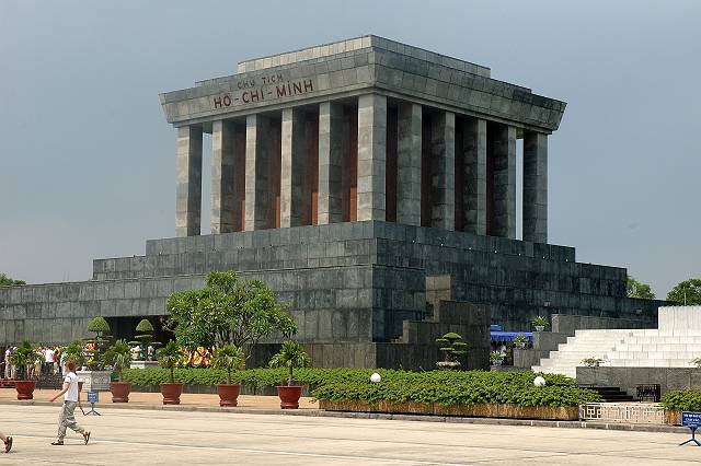 ホーチミン廟の見学は午前中だけなので最初に行った。9時15分に着いたが、すでに長い行列ができていた。厳重なセキュリティーチェック、5mおきぐらいに立つ衛兵による警備とチェックなどが印象に残っている。大きなバックは持って入れないので預けて、小さな貴重品だけを携行した。それでも途中で衛兵に呼び止められて、列から離れて中味を確認される。おしゃべりをしていると、「しー」というジュエスチャーで注意される。脱帽を要求される。建物に近づくにしたがってぴりぴりとした雰囲気が伝わってくる。建物内は冷房が効いてひんやりしている。外の暑さとは対照的だ。行列はホーチミンの棺の周りを回って外に出るのだが、待ち時間に比べると見る時間はほんのすこしだ。棺はガラスケースでおおわれている。顔がライトアップされているので外からよく見える。とてもきれいで、まるで蝋人形のようでもある。棺の周りに4人の衛兵が配置していて微動だにしない。大変だろうなあ、などとよけいな方に考えが及ぶ。建物から出たのは11:00頃だったろう。