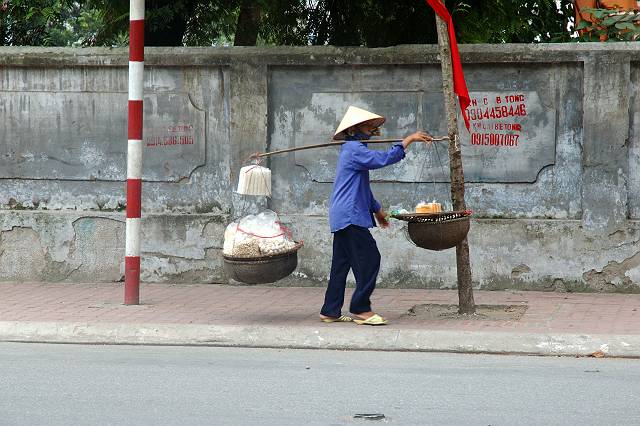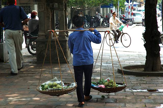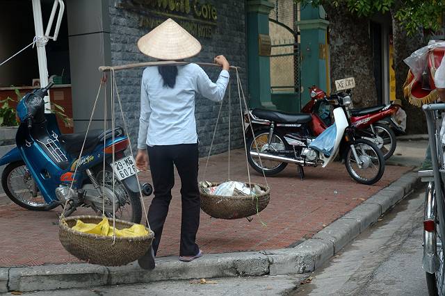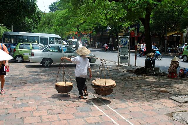 ハノイ市内観光ではノンをかぶり、天秤棒で行商に出ている人を見かけることも多かった。