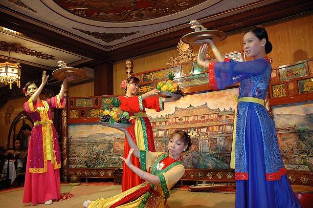 私たちは食べ物にも神経質になってしまった。そのため、ベトナム民族音楽を聴きながらの夕食をキャンセルして、ホテルへ直行しようと考えていた。でも、リンさんが是非にと勧めてくれるので、行ってみることにした。ショーは始まっていて、案内された我々のテーブルはステージのすぐ目の前にあった。ちょっとびっくりそして感激。食事と民族音楽と踊りに大満足して夕食を終え、ホテルに入った。食べ物の不安もどこかへ消えてしまっていた。
